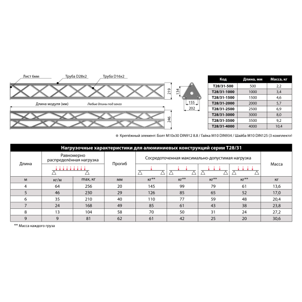 Крепежный элемент: Болт M10x30 DIN912 8.8 / Гайка М10 DIN934 / Шайба M10 DIN125.3 комплекта (в поставку не входят).