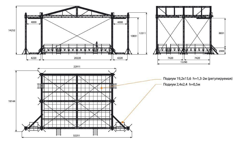 Сценический комплекс с замкнутым коньком с размером подиума 19,2 х 15,6 м, с электрической лебедкой и звуковыми порталами