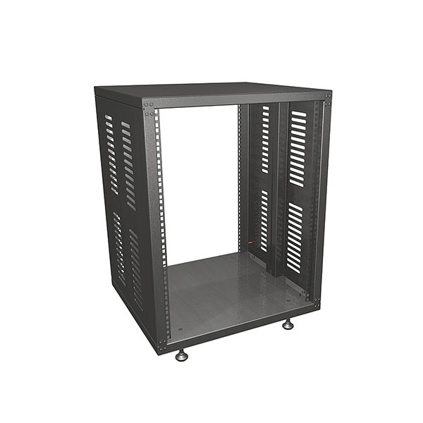 Рэковый шкаф состоит из основания с четырьмя регулируемыми ножками, верхней крышки и двух несущих боковых стенок. Перфорация для крепления оборудования расположена с передней и задней стороны стойки. Предусмотрены крепления для установки колесных опор (приобретается отдельно). Возможно изготовление рэковых шкафов с задней стенкой и дверкой с замком.