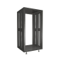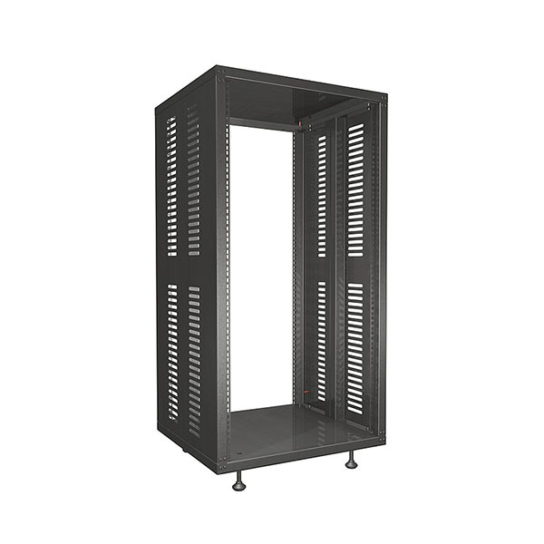 Рэковый шкаф состоит из основания с четырьмя регулируемыми ножками, верхней крышки и двух несущих боковых стенок. Перфорация для крепления оборудования расположена с передней и задней стороны стойки. Предусмотрены крепления для установки колесных опор (приобретается отдельно). Возможно изготовление рэковых шкафов с задней стенкой и дверкой с замком.