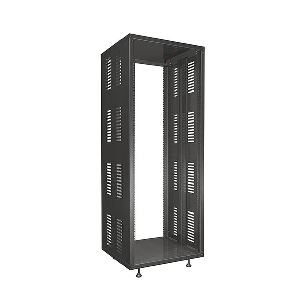 Рэковый шкаф состоит из основания с четырьмя регулируемыми ножками, верхней крышки и двух несущих боковых стенок. Перфорация для крепления оборудования расположена с передней и задней стороны стойки. Предусмотрены крепления для установки колесных опор (приобретается отдельно). Возможно изготовление рэковых шкафов с задней стенкой и дверкой с замком.