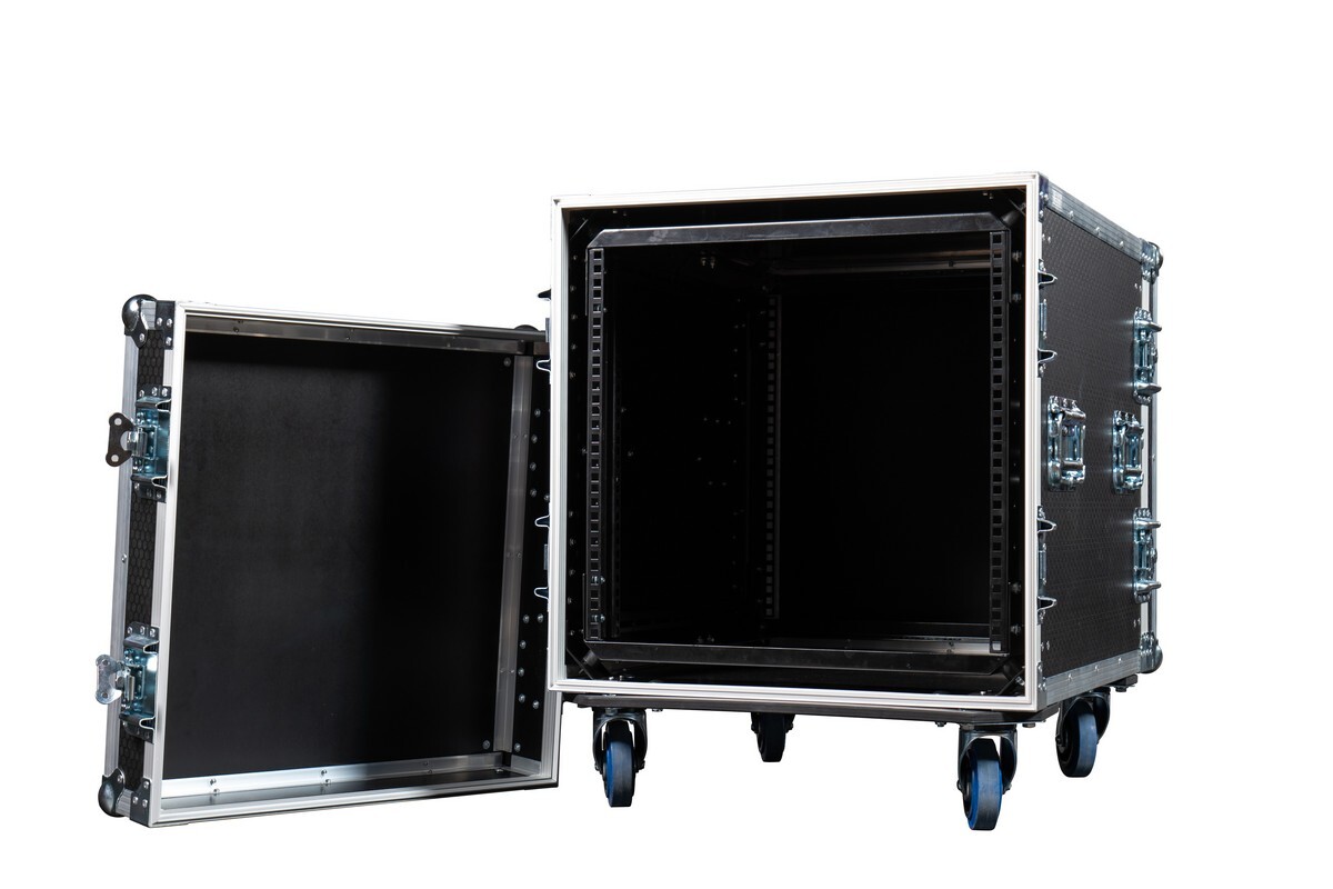 Рэковый кейс 10U, глубина 480 мм, DIN рейка с 2-х сторон на раме АНТИ-ШОК, ламинированная фанера 9 мм, с колесами d 100 мм, 2 колеса с тормозом.