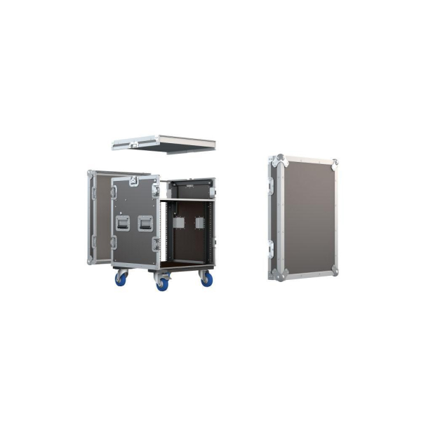 Рэковый кейс 10U с верхней консолью 10U, глубина 480мм, DIN рейка с 2-х сторон, ламинированная фанера 9мм, с колесами d100мм, 2-а колеса с тормозом.