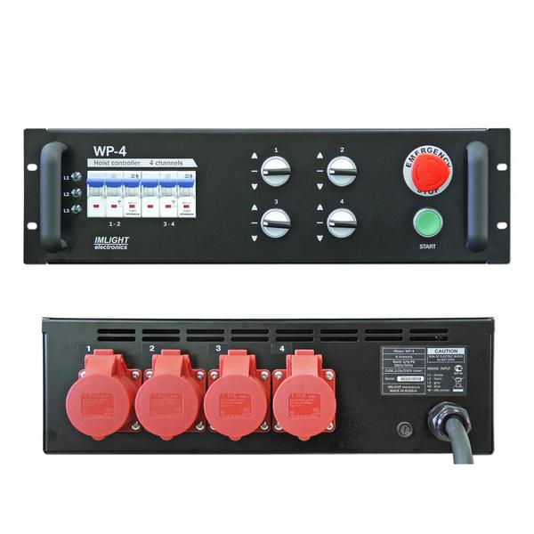 Блок управления цепными лебедками, 4 канала, автоматы 3п10А, реверсивные контакторы, ввод питания: кабель с вилкой CEE 5п32А, подключение потребителей: розетки CEE 4п16А — 4 шт, органы управления на передней панели, исполнение корпуса рэковое, высота 3U