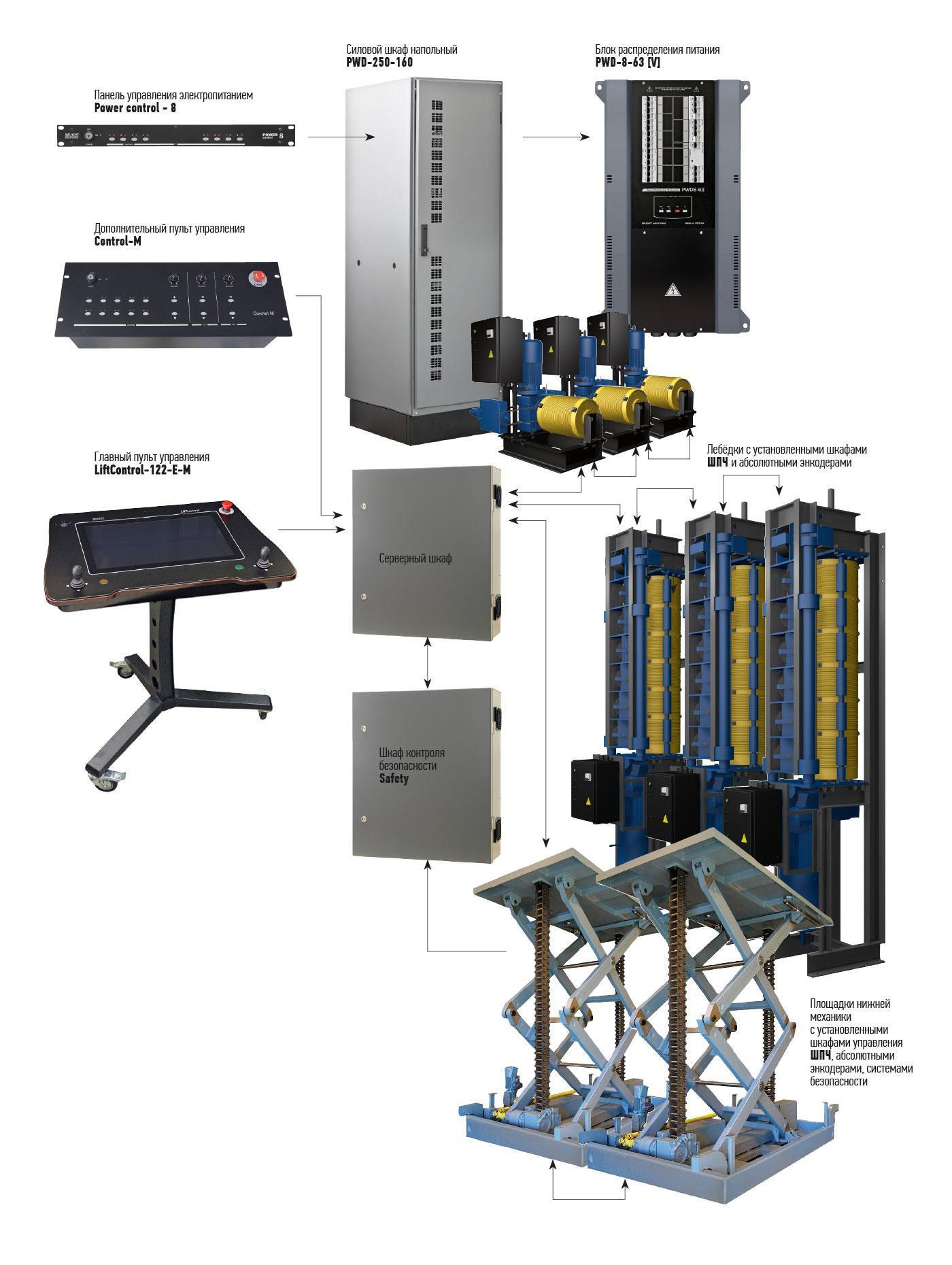 Компьютерная система управления механическим оборудованием сцены. Состоит из главного пульта управления, резервных пультов, сервера, энкодеров, шкафов местного управления, систем безопасности. Предназначена для управления всеми механизмами сцены в ручном и автоматическом режимах с возможностью синхронизации приводов по скорости, положению, времени. Система управления централизованная, связь с датчиками и приводами по протоколу Ethercat, датчики положения совмещенные – абсолютный + инкрементальный. Связь с пультом управления по протоколу – EtherNet.