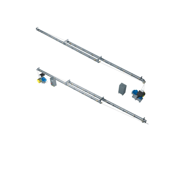 Дорога занавеса представляет собой балочную конструкцию, на которой фиксируются направляющие для перемещения кареток. По направляющим перемещаются ведущие и ведомые каретки. В центре дороги установлены обводные блоки. Дорога занавеса оборудована горизонтальным и вертикальным блоками с натяжным устройством. Канат запассовывается на барабане лебедки занавеса и проходит через один из вертикальных блоков. Далее канат фиксируется на ведущей каретке и, огибая обводной блок, проходит через горизонтальный блок. С горизонтального блока канат сходит и фиксируется на второй ведущей каретке. Далее, огибая обводной и вертикальный блоки, канат запассовывается на барабане лебедки. Ведущие каретки перемещаются по направляющим с помощью каната, закрепленного на барабане лебедки. Управление электрической лебедкой занавеса производится с пульта управления.