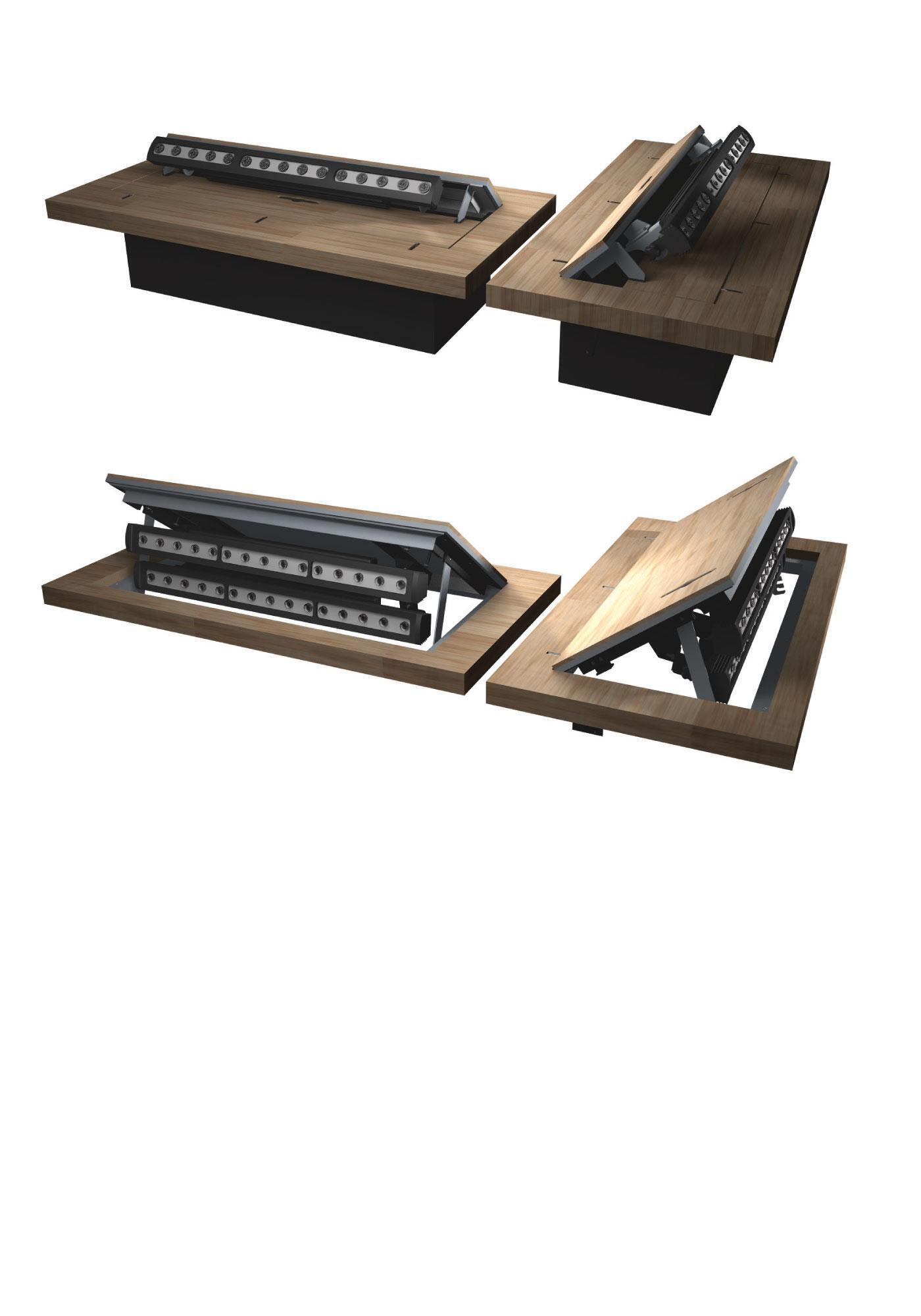 В зависимости от пожелания заказчика и технологических требований, рампа стационарная врезная изготавливается в нескольких исполнениях для возможности однорядного и двухрядного крепления светодиодных приборов FOS-100, так же имеется возможность изготовления рампы с уменьшенными высотными размерами крышки при ее рабочем положении.