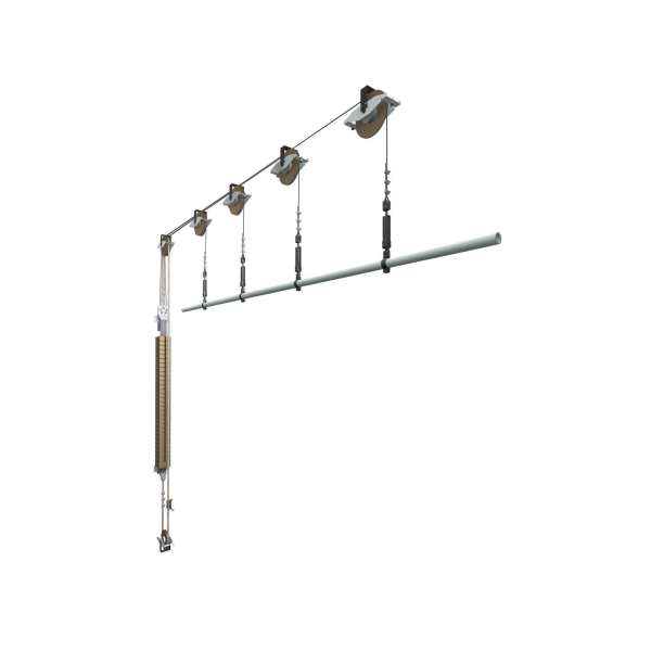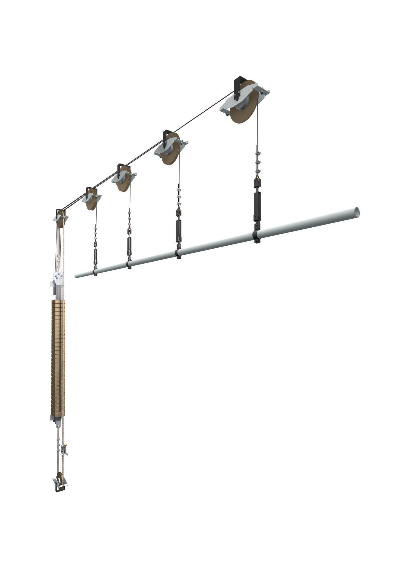 Подъем декорационный сценический противовесный представляет собой металлическую штангу, закрепленную при помощи хомутов и талрепов к стальным канатам. Канаты, огибая обводные блоки, крепятся к противовесу, который уравновешивает штангу декорационного подъема.