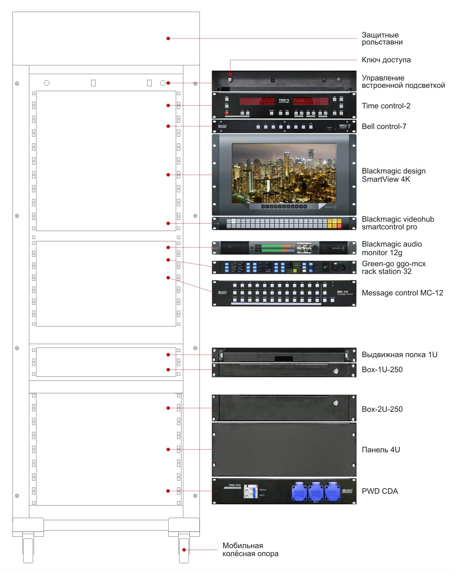 • 10U — верхняя утопленная секция, подходит для размещения мониторов и оборудования, требующего визуального контроля;