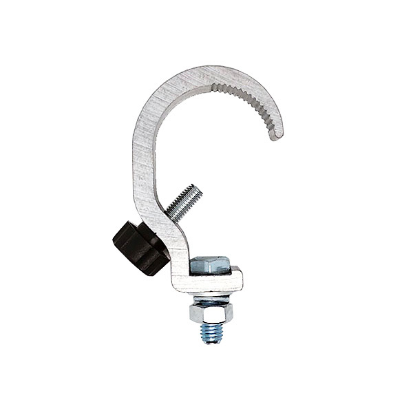 Алюминиевая струбцина крюк шириной 25 мм с винтовым фиксатором для трубы d48–51 мм. Допустимая нагрузка 70 кг.