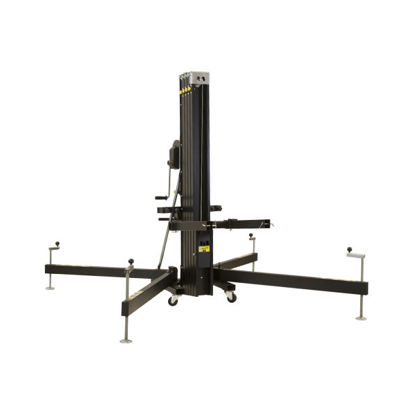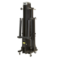 Универсальный элеватор фронтальной загрузки для линейных массивов, светодиодных экранов и ферм, с четырьмя секциями и возможностью блокировать на разной высоте, с индикатором уровня горизонтального положения, с транспортировочными колесами.