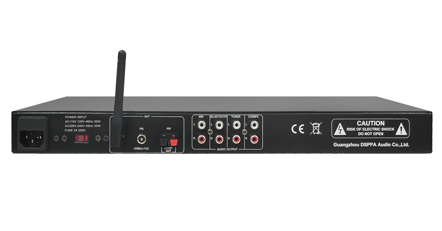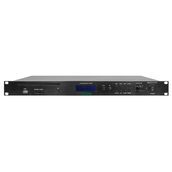 Проигрыватель имеет встроенные источники аудио сигнала, FM-тюнер, CD-плеер, МР3 -плеер (SD, USB), Bluetooth.