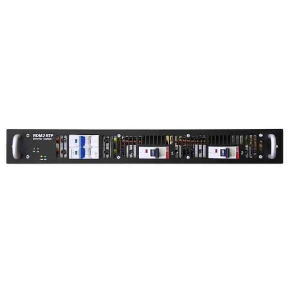 Универсальный модуль RDM2-5TP имеет два режима управления для каждого канала: диммер — для регулировки яркости галогеновых ламп, и свитчер — для управления питанием нерегулируемых цепей. Переключение режимов позволяет выбирать нужный тип управления нагрузкой в линии в зависимости от задач (например, в планшетных лючках), а также осуществлять плановое обновление парка приборов с ламповых на интеллектуальные (светодиодные) без замены модулей управления в стойке.