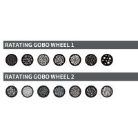 Cтроб – 0-25 Гц, 2 колеса по 7 вращающихся дихро-гобо (среди которых объемное гобо «пузыри», а также тематические гобо «звезды», «цветы», «волны», «огонь», «северное сияние» и др.), gobo shake.