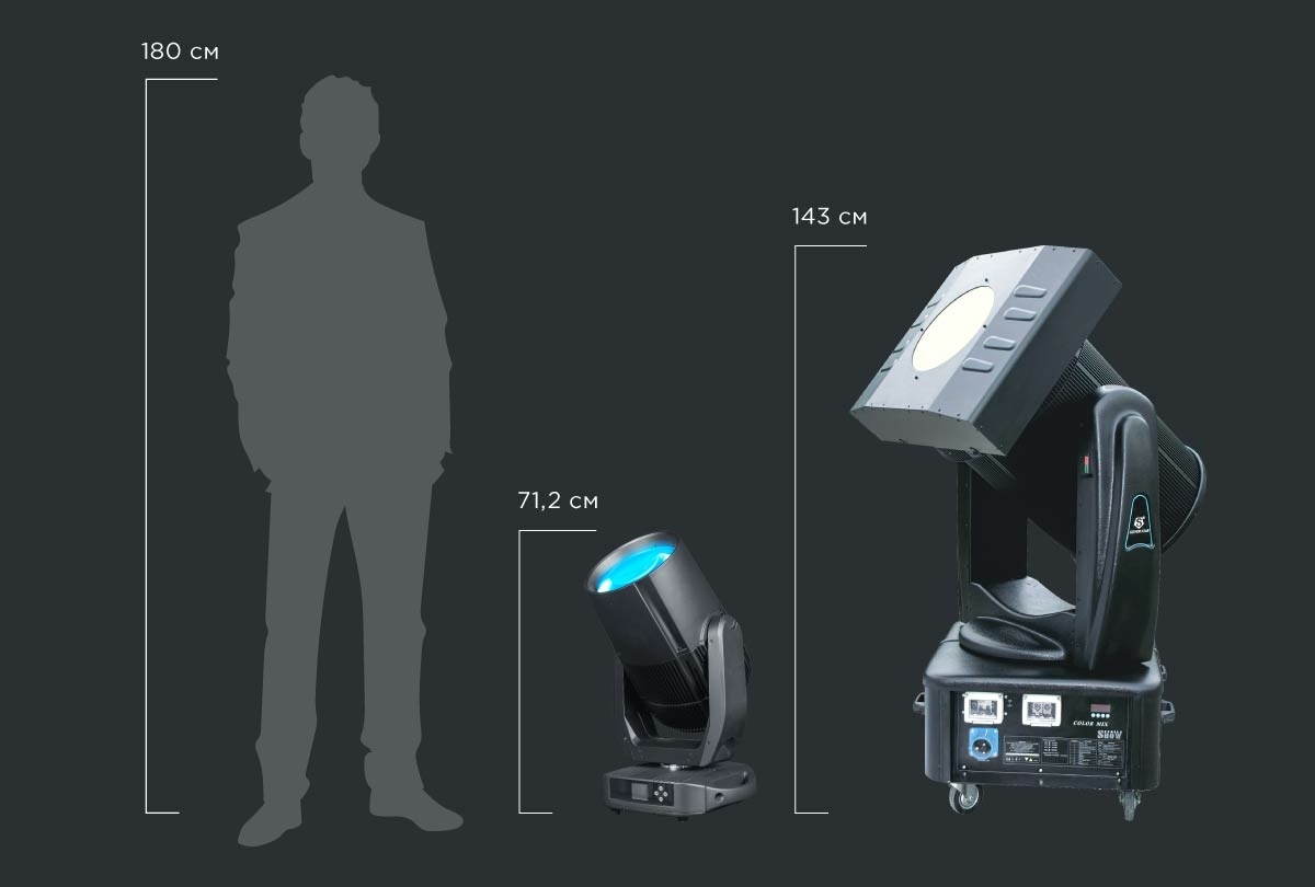 На изображении можно увидеть реальное соотношение размеров старого (Silver Star) 4-киловаттного ксенонового зенитного прожектора YX-320 ColorMix и нового NEPTUNE SUPER BEAM.