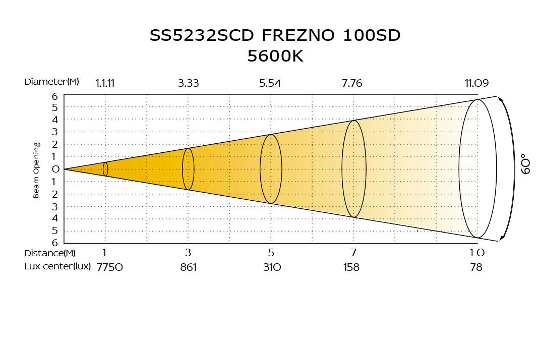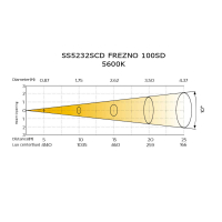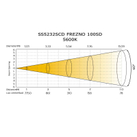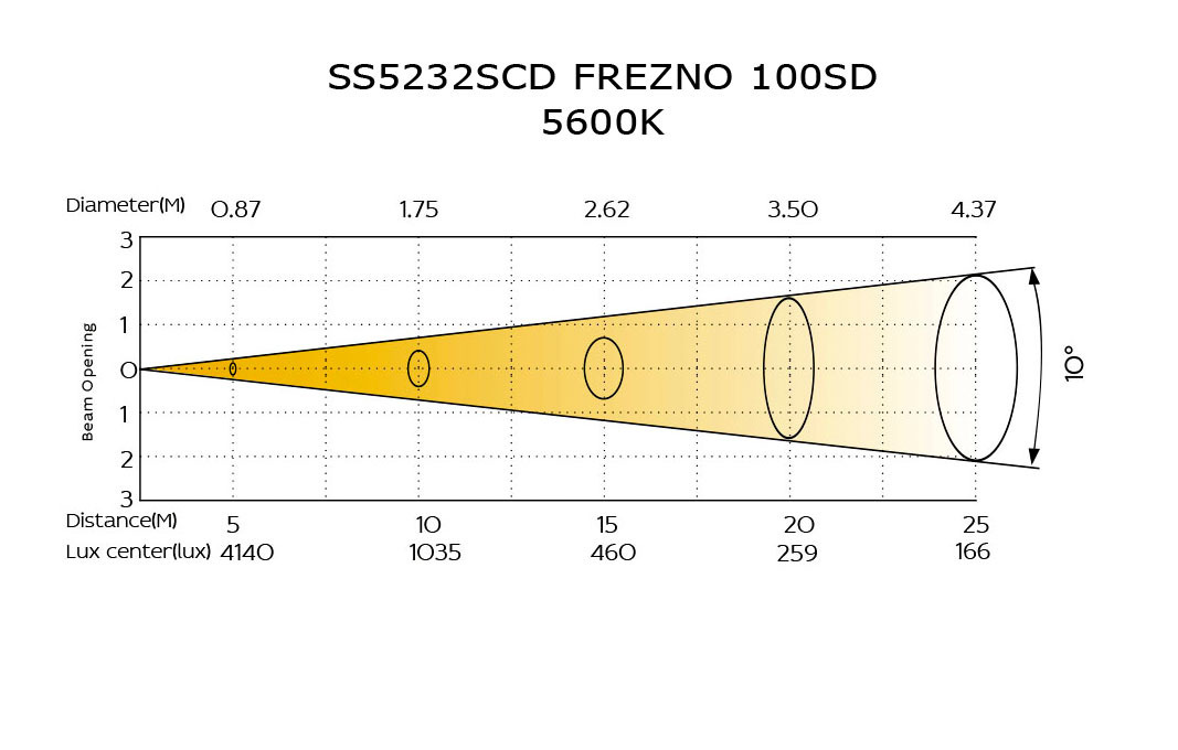 Это новый FREZNO 100SD, выпускаемый в версиях SS5232SWD (3200К) и SS5232SCD (5600К). Новый 100 Вт LED дает CRI:96,1 и показатель R9:95. Освещенность «холодной» версии на 5 м при зуме 10°-60° составляет 4140 и 2310 люкс соответственно, что значительно лучше по сравнению с предыдущим аналогом SS810SW HD FREZNO ZM-1 HD - 3150 и 278 люкс на аналогичных углах раскрытия луча. Новая линза делает луч более равномерным, появилась возможность прямого подключения (с авто определением) к диммеру, и, конечно, DMX, RDM. 4-х лепестковые шторки заказываются отдельно. Данный прожектор предназначен для средних и малых сценических площадок или на выставках, где он может легко показать, что LED освещение лучше лампового.