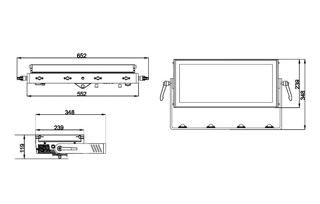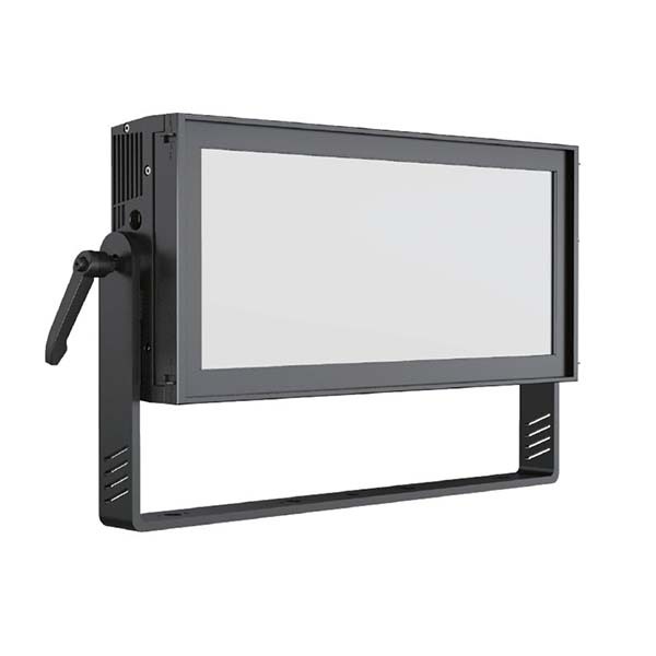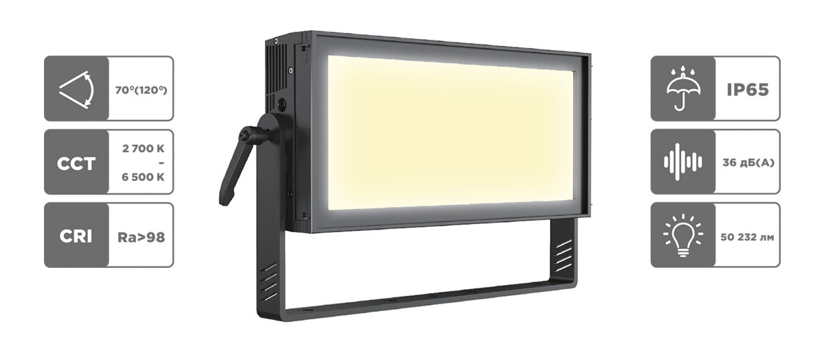E-LITE (SS2361TCM) Заливной всепогодный светильник использует 880 шт. х 0,5 Вт LED, мощность светового потока - 50 232 люмен, с равным количеством (по 440 шт.) теплых и холодных белых LED. Прибор имеет равномерное смешение разных по ССТ светодиодов. Линейная регулировка CCT 2700-6500K, индекс цветопередачи CRI (Ra)> 98, возможность идеального отображения широкого спектра цветовой температуры без дополнительных фильтров. Очень широкий угол освещения в 70° с затуханием поля освещения до 120°. Сверхтихий водонепроницаемый вентилятор обеспечивает эффективное рассеивание тепла и низкий уровень шума 36 дБ(А). Весьма компактный размер и малый вес прибора не мешают достигать высокого уровня освещенности - 983 люкс на 5 м. Уровень защиты IP65 и универсальное питание обеспечивают многостороннее использование данного светильника в самых разных проектах.