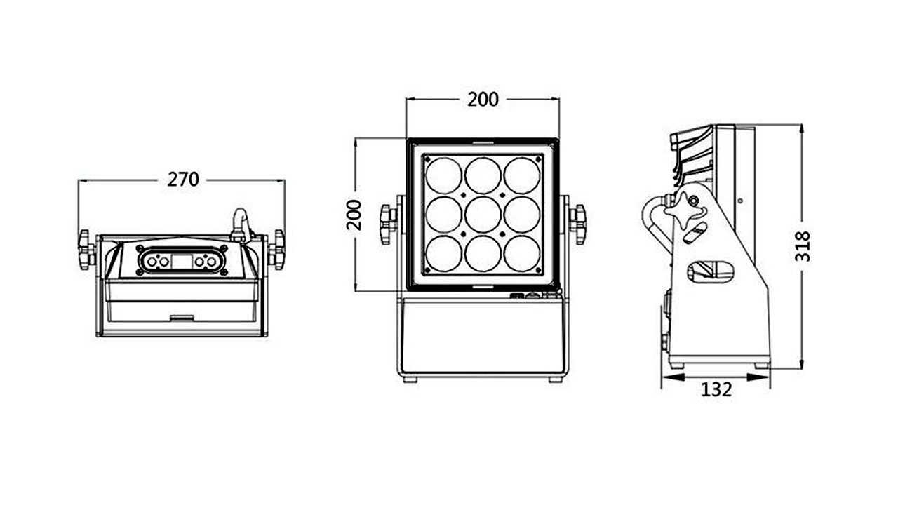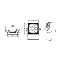 cubeSPOT 9 - Всепогодный светодиодный светильник для мобильной напольной установки или подвеса. Излучающая панель поворачивается на 90 градусов.  Источник света 9x20W (RGBW) LED выдает силу света в 237 500 Кд при угле раскрытия луча 6°, что дает освещенность в 300 люкс на дистанции 28 м. При использовании фрост-фильтров 10° / 20° / 30°, которые размещаются под магнитной накладкой, поле освещение значительно расширяется. Опционально можно заказать ассиметричные фильтры, например, 10°х60° для расширения горизонтального или вертикального поля.