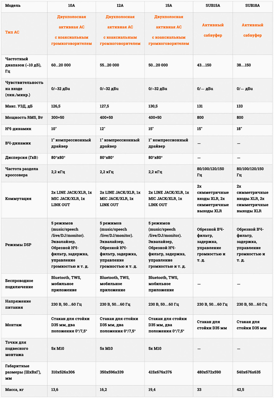 Усилительный модуль широкополосных систем состоит из двух усилителей (Biamp, Class D + AB), очень любопытного управляющего процессора с большим дисплеем и тремя входами (включая микрофонный). Особого внимания заслуживает система управления DSP, которая, помимо прямого управления с панели модуля, позволяет воспользоваться мобильным приложением, где пользователю предоставляется удобный доступ ко всем параметрам процессора. К ним относятся заводские базовые пресеты, рекомендуемые в работе с акустическими системами в различных случаях (включая монитор), эквализация, задержка сигнала, микшер, а также стереофонический (TWS) Bluetooth-плеер и т. д. Приложение доступно как для устройств на базе Android, так и для iOS.