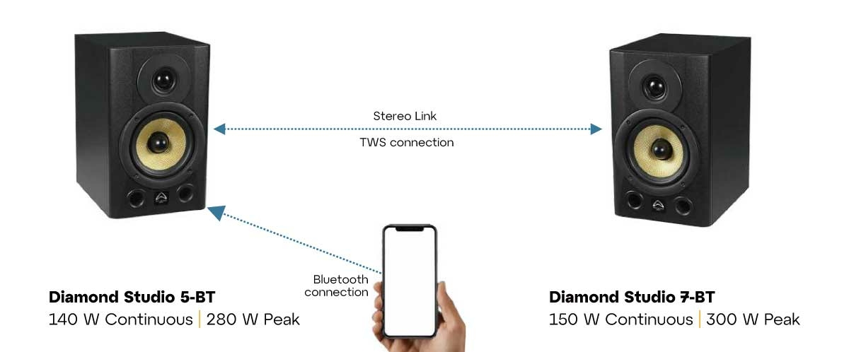 Для российских пользователей предлагаются две модели мониторов — DIAMOND STUDIO 5-BT и DIAMOND STUDIO 7-BT. Обе модели оснащаются новейшим дюймовым мягкокупольным твитером, очень точно передающим все нюансы ВЧ-спектра сигнала, и вуфером с очень лёгким диффузором из стекловолокна диаметром 5 или 6,5 дюйма. Усилительный модуль класса D состоит из двух блоков (Bi-Amp) и оснащён откалиброванными регуляторами ВЧ и НЧ. В конструкции усилительного модуля предусмотрены все типы входных разъёмов, в том числе бытового назначения — XLR, JACK и RCA. Беспроводное соединение может осуществляться при помощи Bluetooth.