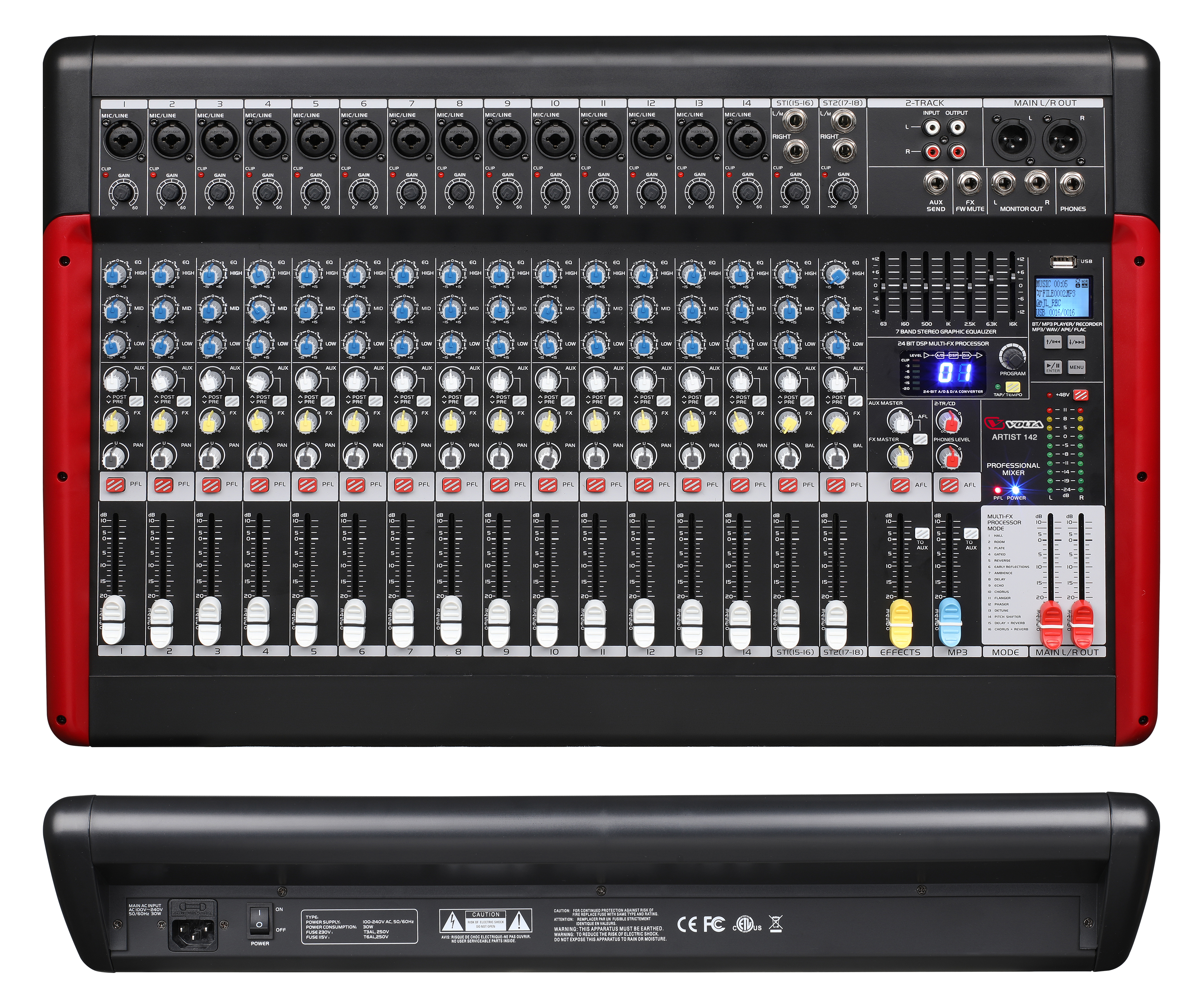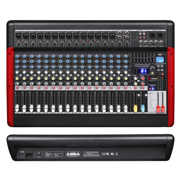 Микшерный пульт VOLTA ARTIST 142 предназначен для использования в комплектах звукоусиления для сведения сигналов от различных источников — микрофонов, музыкальных инструментов, различных плееров. Микшер ARTIST 142 позволяет одновременно использовать сразу 14 монофонических линейно-микрофонных входов и 2 входных стереопары. Каждый входной канал оснащён 3-полосным эквалайзером, посылом на встроенный эффект, панорамой и посылом AUX с переключением PRE/POST. Мастер-выходы оснащаются 7-полосным графическим эквалайзером.