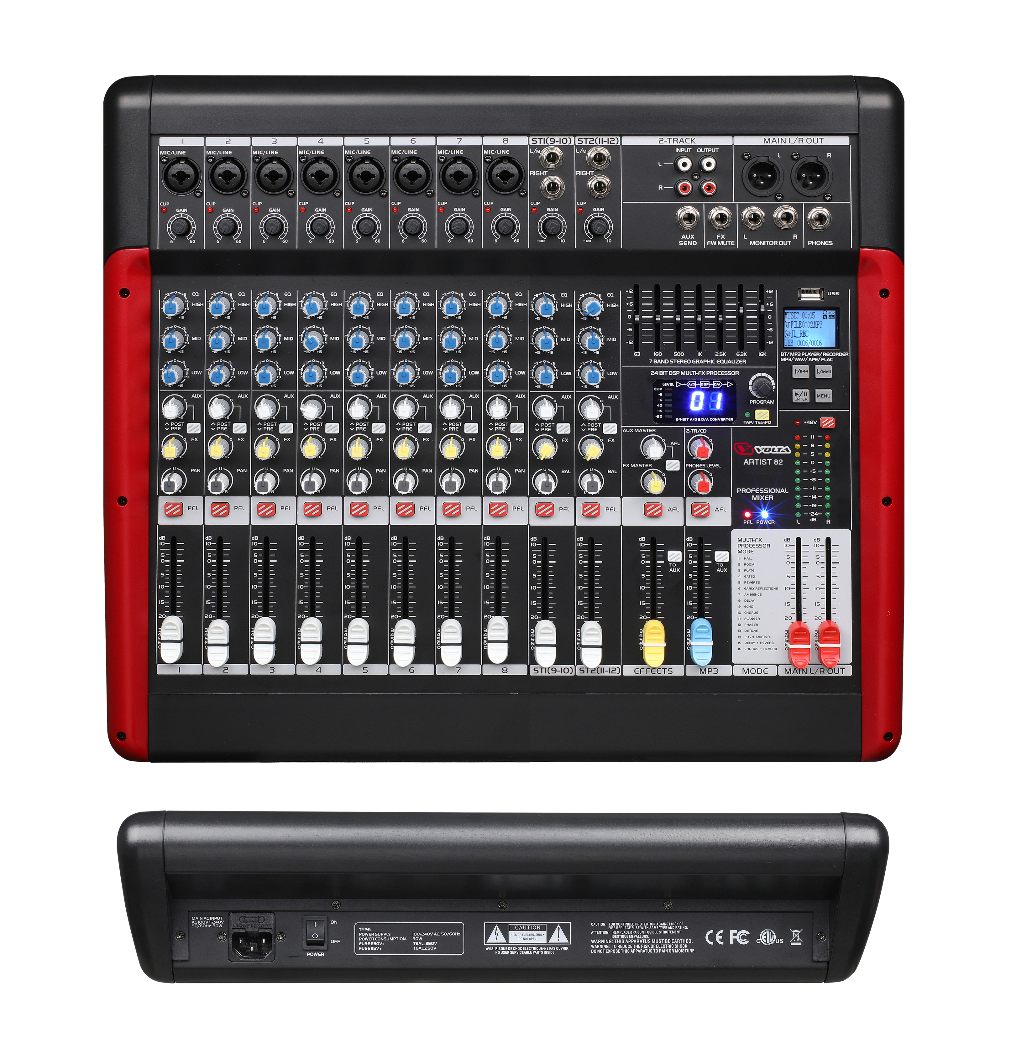 Микшерный пульт VOLTA ARTIST 82 предназначен для использования в комплектах звукоусиления для сведения сигналов от различных источников — микрофонов, музыкальных инструментов, различных плееров. Микшер ARTIST 82 позволяет одновременно использовать 8 монофонических линейно-микрофонных входов и 2 входных стереопары. Каждый входной канал оснащён 3-полосным эквалайзером, посылом на встроенный эффект, панорамой и посылом AUX с переключением PRE/POST. Мастер-выходы оснащаются 7-полосным графическим эквалайзером.