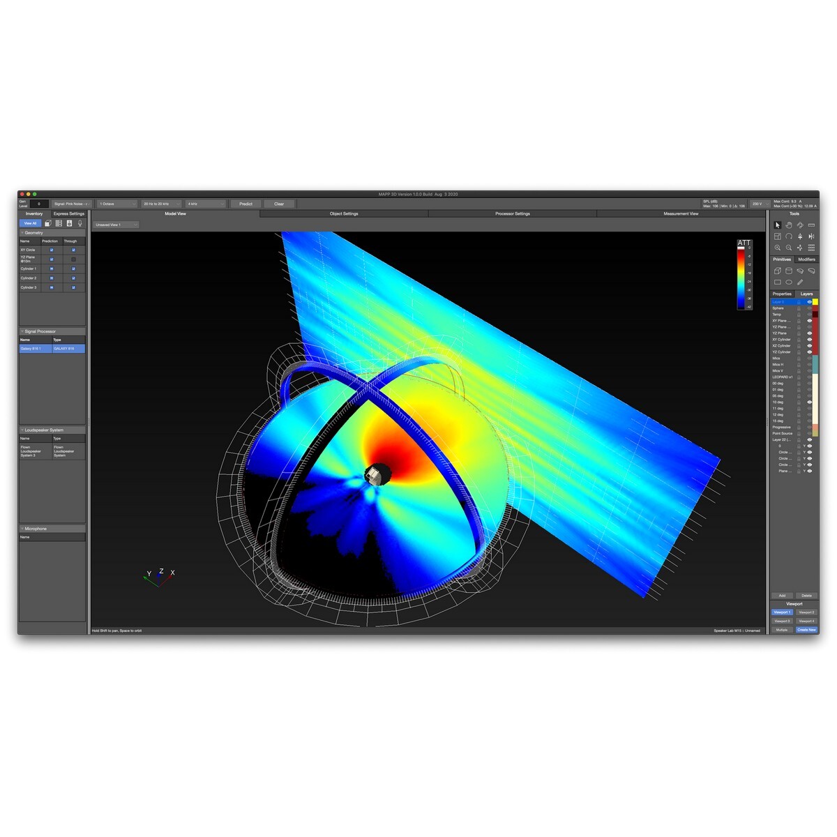 Среди возможностей MAPP 3D — конфигурация направленных низкочастотных систем, автоматический расчет углов элементов линейных массивов, различные параметры представления измерений, поддержка разных типов тестового сигнала (M-noise) и многое другое.