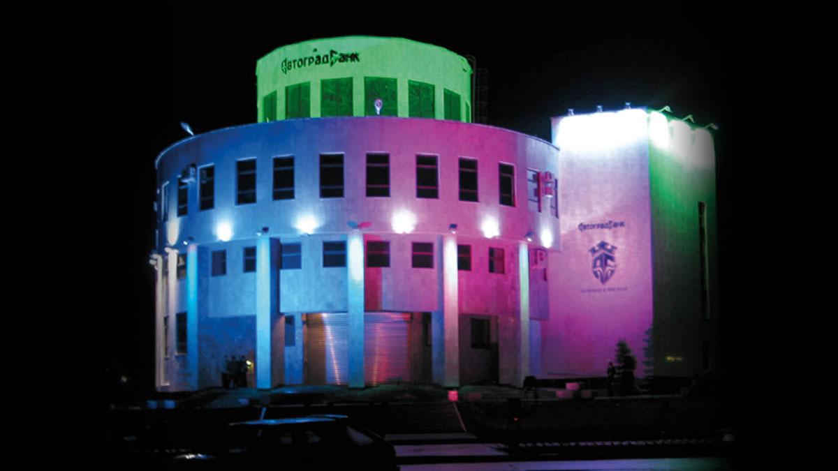 Общий заливающий свет фасада обеспечивается приборами "Panorama" и общим прибором "CityColor 1800". Для акцентирования логотипа банка на правой стороне здания использовали прибор "CityBeam 1200". Башня на крыше здания "залита" приборами ZENITH с газоразрядными лампами BLV-150 зелёного цвета. Для подчеркивания объёма здания использованы приборы "MiniCity 150". Световой поток направлен на колонны у входа в здание. Межоконные проемы засвечены приборами MACH-3 с газоразрядными лампами белого цвета и приборами ZENITH с лампами синего цвета. Заливающий свет правой стены здания обеспечивается приборами ZENITH с газоразрядными лампами зеленого и синего цвета.