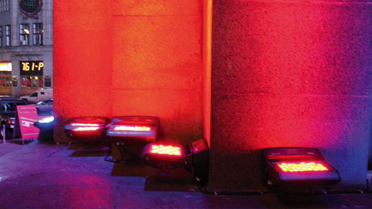 Проанализировав пожелания заказчика, выбор пал на световые приборы с использованием светодиодных технологий. Учитывая статус проекта и архитектурные особенности здания, было предложено выполнить освещение на LED архитектурных светильниках компании SGM с RGB смешением цветов и со степенью защиты IP65.