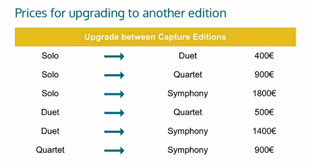 Если когда-то вы захотите новую версию Capture, то обновление до новой версии без смены редакции будет стоить от 99 до 149 евро в зависимости от текущей редакции вашей лицензии. ВАЖНО! Не нужно платить несколько раз за переход, скажем, с версии 2019 на 2020, а потом ещё раз с 2020 на 2021, и вновь заплатить для перехода с 2021 на 2022. Апгрейд приобретается один раз до текущей (самой новой) версии программы. Но с выходом новой версии в следующем году вам вновь придётся заплатить сумму апгрейда для перехода на более новую версию, если это необходимо.