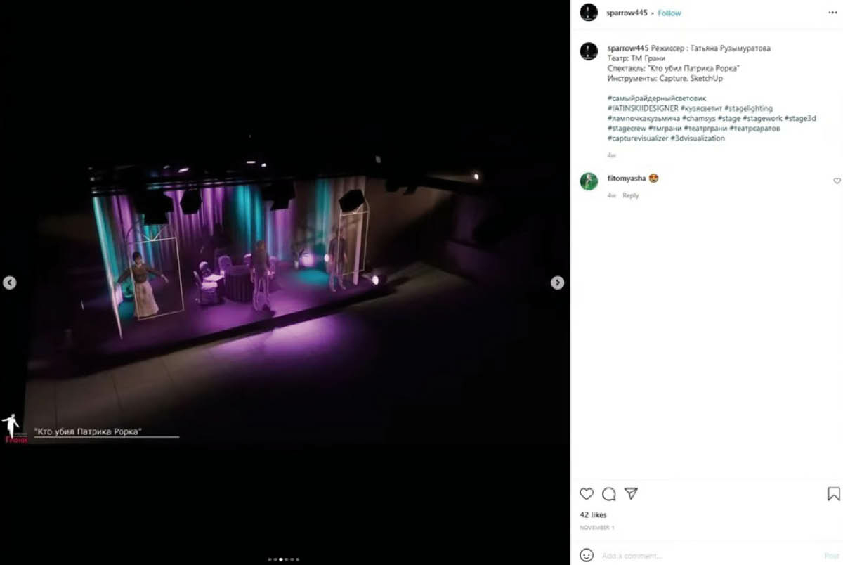 Стоит напомнить, что мы также рады видеть ваши работы в наших кругах. Их вы можете прислать в сообщения в группе ВК. Как например это сделал Кузьма Воробьев с визуализацией спектакля «Кто убил Патрика Рорка» от ТМ Грани. Этот пост в инстаграме также был отмечен на трансляции.