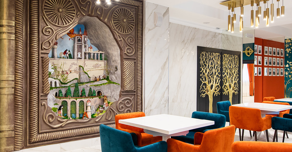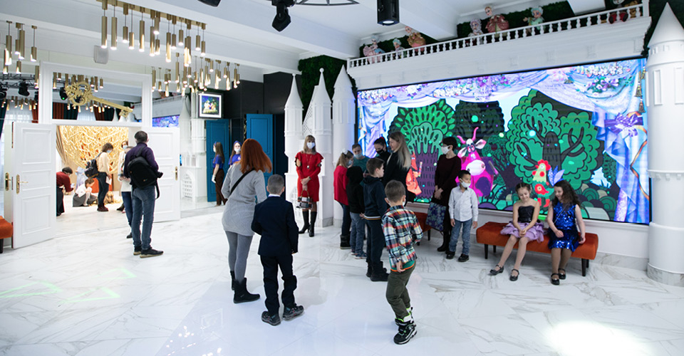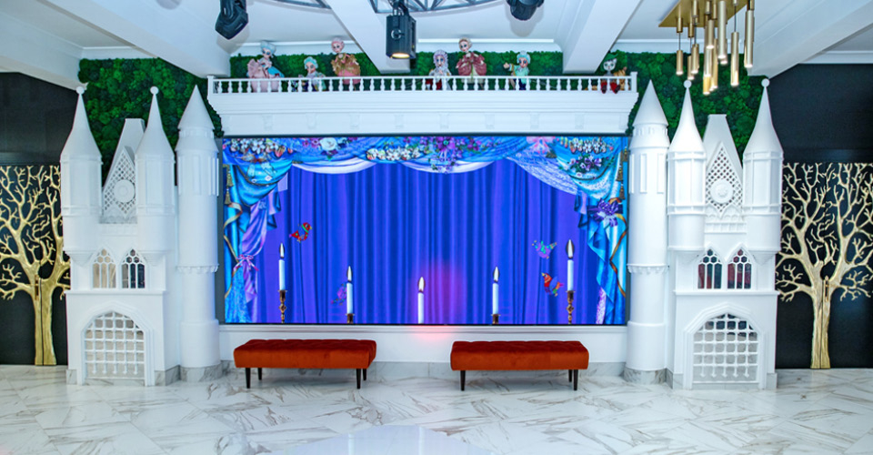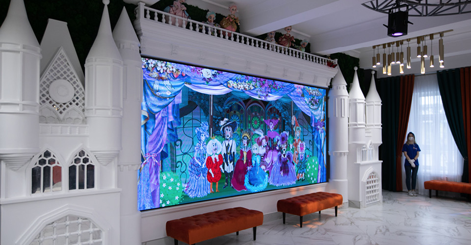 Светодиодный экран Mr.LED является частью арт-объекта, занимающего пространство центрального фойе. Благодаря авторскому дизайн-проекту, сейчас сказка в театре кукол живет не только на сцене – для зрителя погружение в историю начинается уже в интерьерах театра. Через сказочный лес – в сказочный замок. Современные технологии отлично справляются с запросом на иммерсивность, а LED-экран расширяет функциональные возможности театрального фойе, которое перестало быть традиционным местом ожидания «первого звонка». Возможности экрана Mr.LED позволяют использовать видеоконтент в качестве декораций к всевозможным интермедиям и превращать фойе в импровизированный театральный зал.