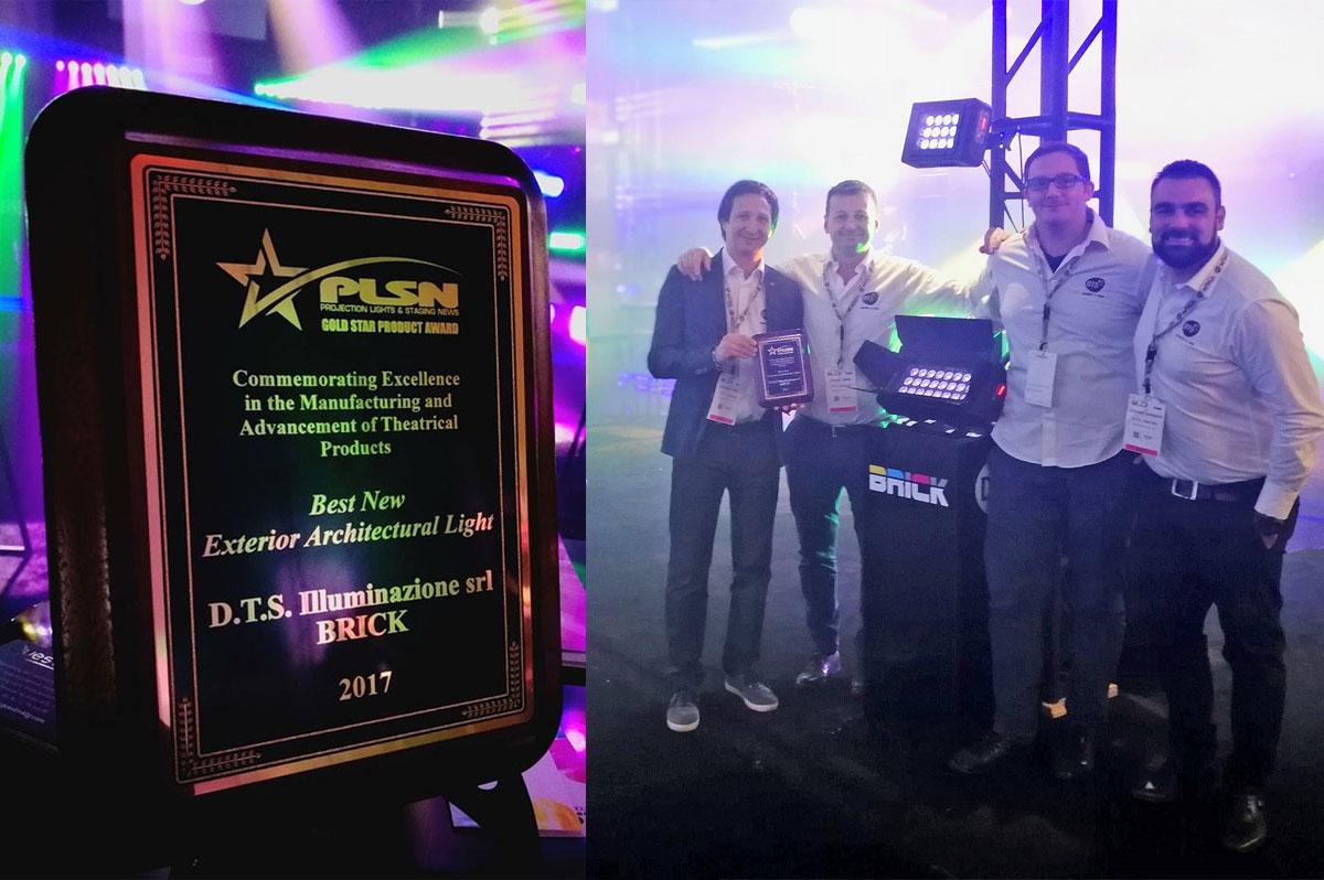 На ведущей выставке профессионального живого дизайна Live Design International (LDI) в Лас-Вегасе компания DTS получила “Золотую звезду” – премию “PLSN Gold Star Product Award”. Светодиодный светильник BRICK был назван «Лучшим новым архитектурным светильником».