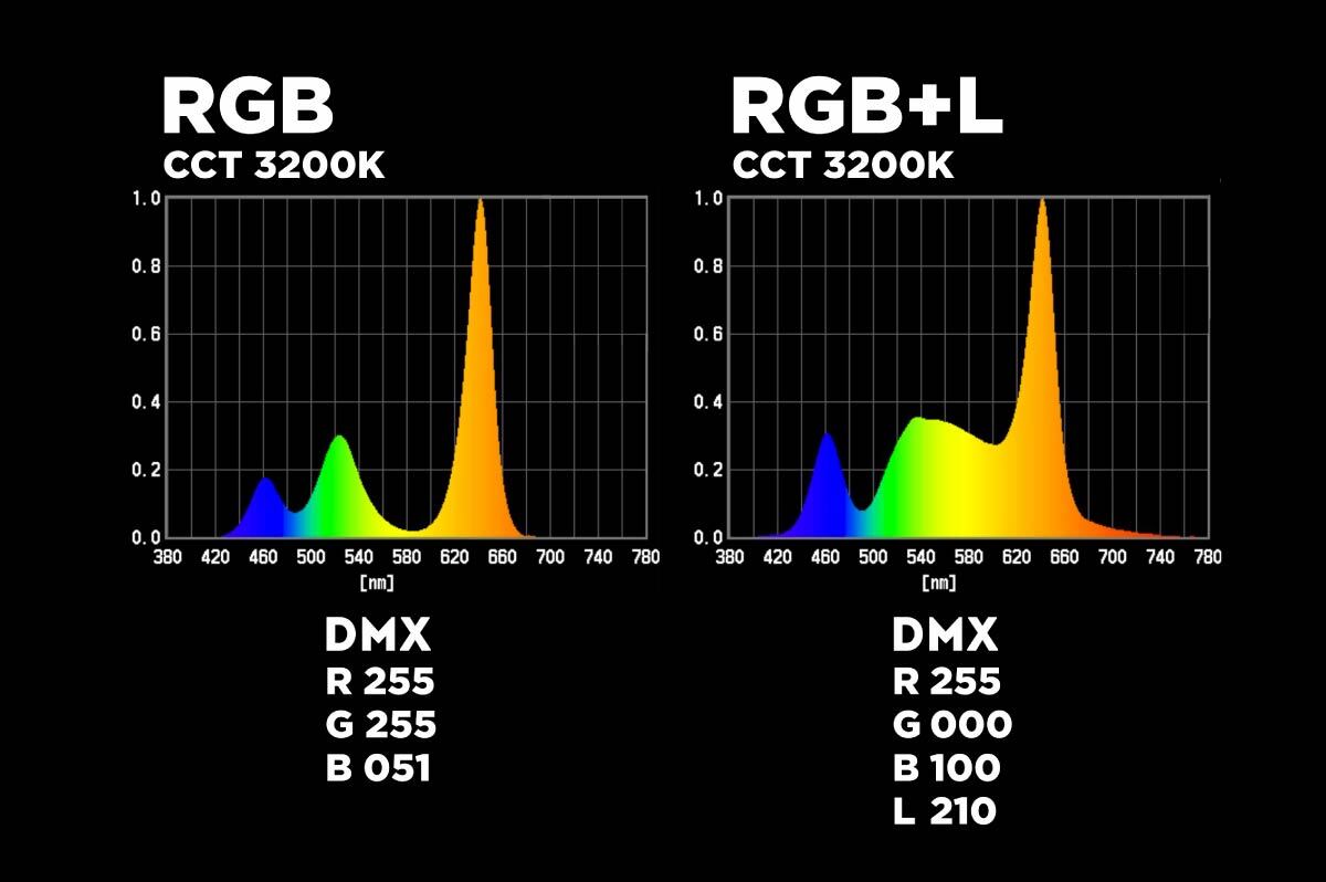 Ключевое различие между RGB- и RGBL‑системами проявляется в спектральном распределении мощности (SPD). Рассмотрим особенности при CCT = 3200 К.