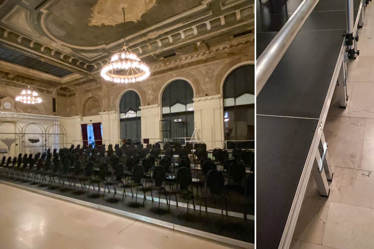 Этот амфитеатр в нашем зале появился в конце мая, отзывы исключительно положительные, мы довольны результатом. Комплект, который у нас сейчас есть, уже работал в различных конфигурациях рассадки. Первый ряд может трансформироваться в боковые станки, также его можно использовать как подиумы для музыкантов - восемь подиумов вполне достаточно, чтобы выстроить площадки, допустим, 2х4 метра или 2х2 метра, сгруппировать их на сцене, чтобы всем было комфортно.