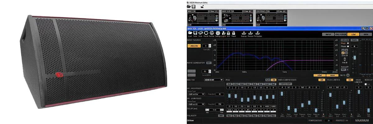 Хорошим примером монитора описанной выше конструкции является акустическая система VOLTA ONSTAGE-210A. Новинка популярного производителя интересна как своей нечасто используемой конфигурацией 2х 10” с центральным расположением драйвера, так и ультрасовременным, насыщенным передовыми технологическими решениями усилительным модулем, разработанным и произведённым компанией MARANI. Многие спросят, а не мал ли 10-дюймовый динамик для metal-сцены? Берём в помощь калькулятор и ученика 5 класса общеобразовательной школы: площадь подвижной части двух 10-дюймовых динамиков значительно больше, чем площадь привычного 12-дюймового динамика, и приближается к площади 15-дюймового! Площадь динамика 12” равна 113 кв. дюймов, двух «десяток» — 157 кв. дюймов, а «пятнашки» — 176,6 кв. дюйма. А пока звуковое давление формируется благодаря передаче звуковых волн в воздушном пространстве за счёт механического колебания диффузора динамика (под действием электромагнитных волн), этот показатель даёт данные для некоторого анализа. Отдельного упоминания заслуживает усилительный модуль, выпускаемый специально для VOLTA всемирно известным разработчиком и производителем процессорно-усилительного оборудования MARANI. Для работы со звуковым сигналом пользователю предоставляются возможности, доступные лишь в топовых моделях рэковых звуковых процессоров. К ним относятся как стандартные функции, например, управление входным усилением, задержкой, шумоподавлением, параметрическим эквалайзером, изменением полярности и т.д., так и продвинутые блоки обработки: динамический фильтр громкости, комплексная RMS-компрессия и ограничение звукового сигнала, а также кроссоверные IIR-фильтры Линквица-Райли, Бесселя, Баттерворта и уникальный MIR-фильтр с линейной фазовой характеристикой, который упрощает работу с фазой в области разделения частот кроссовером при сохранении очень низкой задержки. Удобное и интуитивно понятное управление всеми параметрами выполняется с помощью специального ПО, а для начала работы с акустическими системами предлагаются готовые заводские пресеты, оптимизированные для АС и различных сценариев её использования. Но если вы предпочитаете пользоваться пассивными сценическими мониторами, то у ONSATAGE есть версия без усилительного модуля.