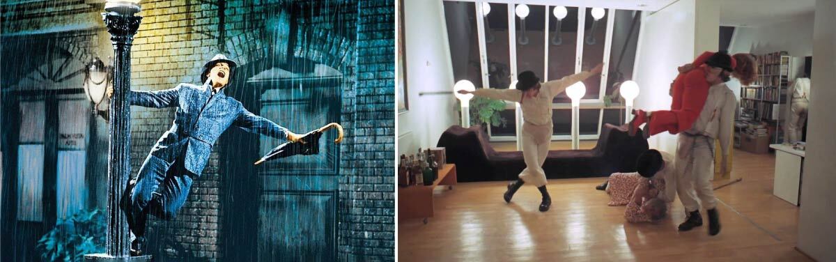 Но связь «Заводного апельсина» с музыкой имеет ещё одну занимательную историю. Режиссёру фильма четыре дня не удавалось добиться желаемого результата во время съёмок эпизода нападения на семью писателя - сцена выглядела слишком скучно (!) и обыденно (!!!). Решив поэкспериментировать, Стенли Кубрик попросил Малколма Макдауэла немного потанцевать в кадре. Главный герой исполнил несколько танцевальных па, припевая единственную знакомую ему песню Singing in the rain из популярного мюзикла. Кубрик был настолько поражен результатом, что немедленно выкупил права на эту песню за 10.000 долларов!