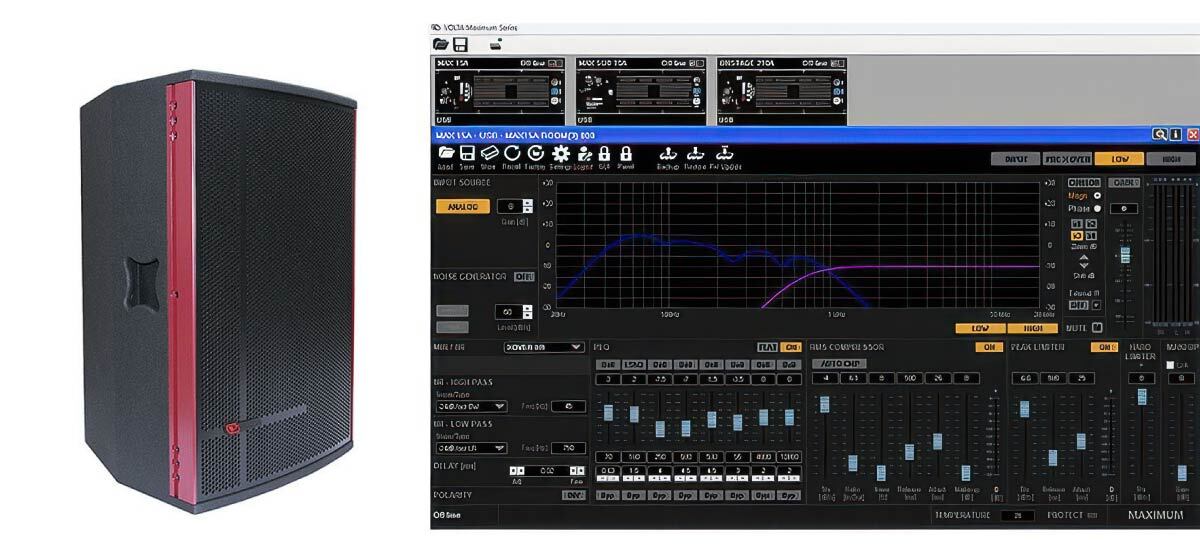 При выборе активных систем лучше отказаться от приборов с открытыми возможностями к изменению параметров, так как слишком велика вероятность некорректного пользования. Например, желая обогатить частотный диапазон, музыкант может полностью выкрутить регулятор низких или высоких частот (а это 15 дБ), усугубив это аналогичным действием на микшере. К чему это приведёт можно не объяснять. Идеальным вариантом будет закрытая конфигурация управления системой с заранее отстроенной и защищённой программой процессора, как в VOLTA MAX 15A. Активные акустические системы VOLTA серии MAXIMUM оснащены усилительными модулями с мощным DSP Marani, который предоставляет широкие возможности по управлению параметрами АС в цифровой среде. К ним относятся как стандартные функции, например, управление входным усилением, задержкой, шумоподавлением, параметрическим эквалайзером, изменением полярности и т.д., так и продвинутые блоки обработки: динамический фильтр громкости, комплексная RMS-компрессия и ограничение звукового сигнала, а также кроссоверные IIR-фильтры Линквица-Райли, Бесселя, Баттерворта и уникальный MIR-фильтр с линейной фазовой характеристикой, который упрощает работу с фазой в области разделения частот кроссовером при сохранении очень низкой задержки.