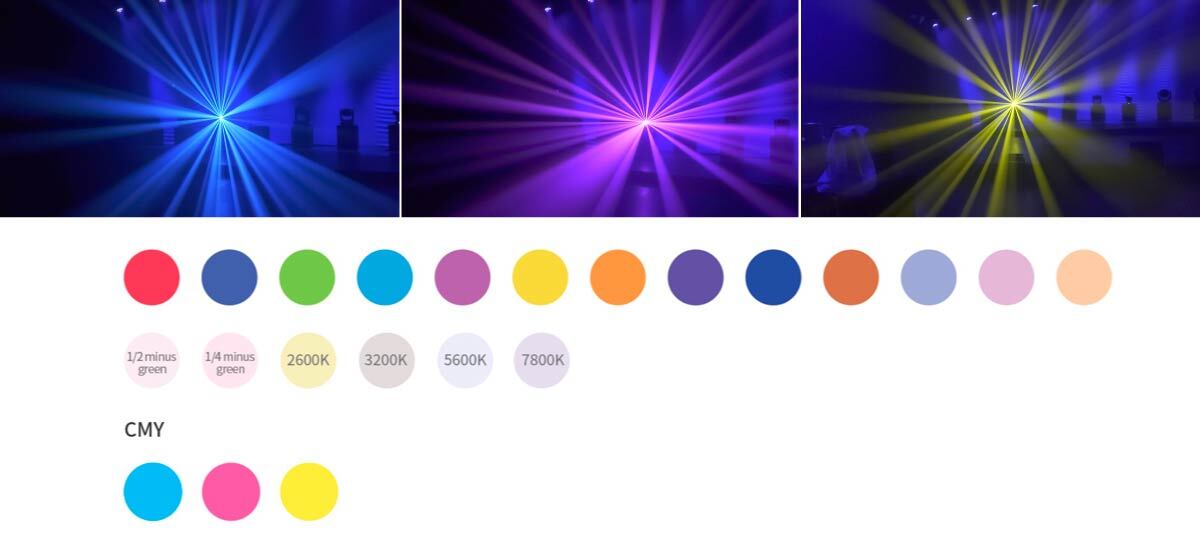 Основное цветосмешение осуществляется лезвиями-фильтрами CMY на высоких скоростях так, что переход из одного цвета в другой практически не заметен. Скорость работы смены лезвий регулируется по DMX512 в пределах 100-1%. Дополнительно - 19 фиксированных цветовых фильтров, создающих широкую палитру более ярких оттенков, среди которых: 1/2 minus green; 1/4 minus green; 2600K; 3200K; 5600K; 7800K. В сочетании с CMY-синтезом, который обеспечивает плавные цветовые переходы и насыщенные тона, наложение фиксированных светофильтров дает дополнительные миллионы оттенков, пастельные тона и корректировки цветов для любого шоу.