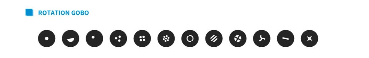 Инженеры Silver Star решили добавить максимум возможного в этот компактный корпус. Колесо гобо имеет 12 вращающихся трафаретов, включающих в себя мин. апертуру и некоторые гобо со смещенными от центра изображениями для эффекта подвижности луча в пространстве.