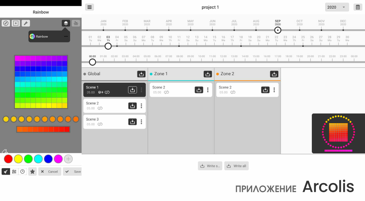 Надёжность прежде всего. При возникновении внештатной ситуации с отключением питания, последняя сцена сохранится в кэше памяти DINA и при повторном включении продолжит воспроизведение с прерванной точки. Программирование интерфейсов осуществляется с помощью нового программного обеспечения Easy Stand Alone Pro 2, важным преимуществом которого является создание сценариев автономной работы. Помимо стандартных сценариев, привязанных к календарю, можно выставлять условия воспроизведения и прерывания световых сцен. Например, запуск сцен при срабатывании датчиков движения, света, влажности или прерывание при получении сигнала от системы контроля пожарных извещателей, или от других экстренных систем.
