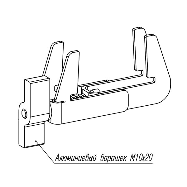 Струбцина применяется для жесткой фиксации платформ между собой в месте прилегания платформ, обеспечивает жесткость и устойчивость подиума. Устанавливается на алюминиевый профиль снизу платформ. Фиксация струбцины осуществляется барашком без применения дополнительных инструментов.