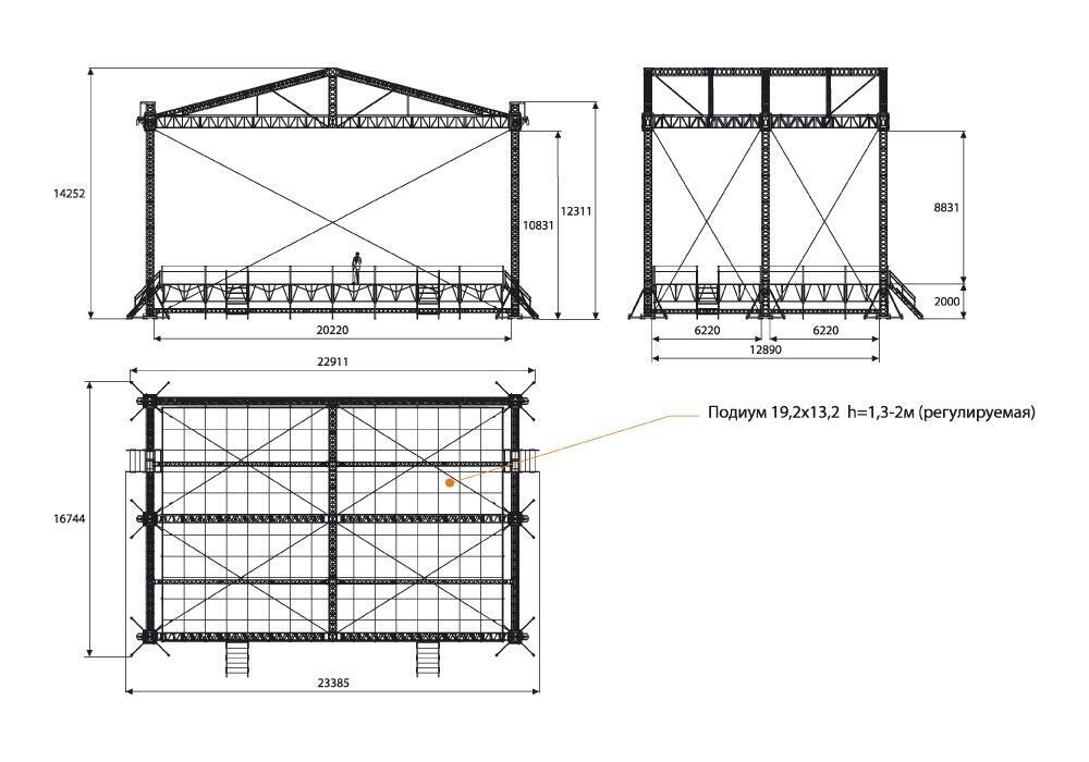 Сценический комплекс с замкнутым коньком с размером подиума 19,2 х 13,2 м, с электрической лебедкой