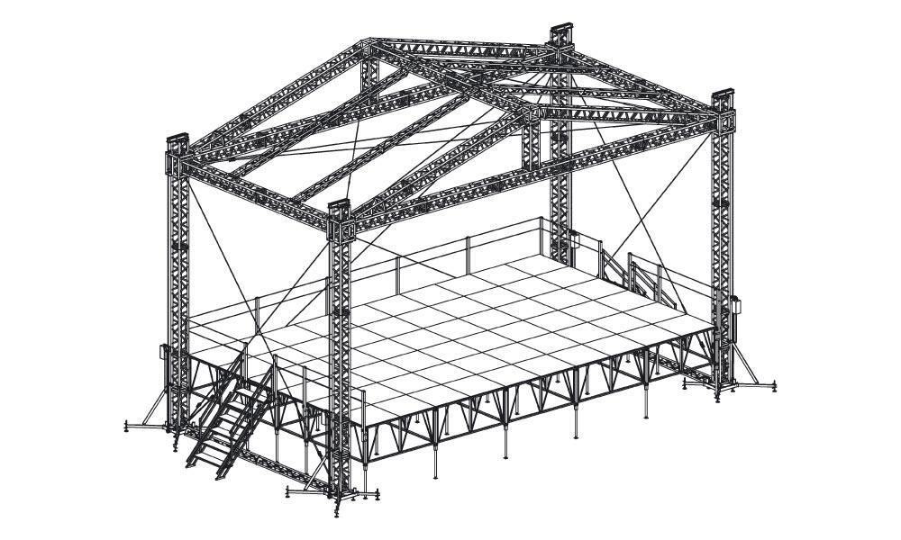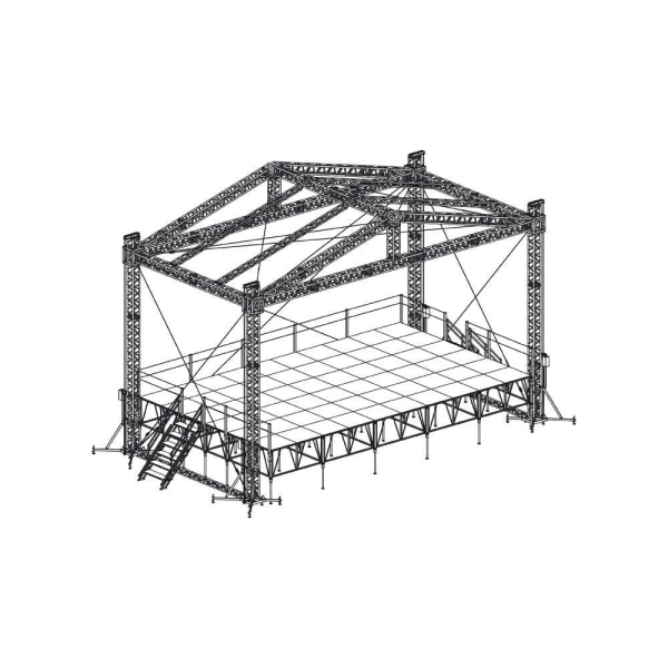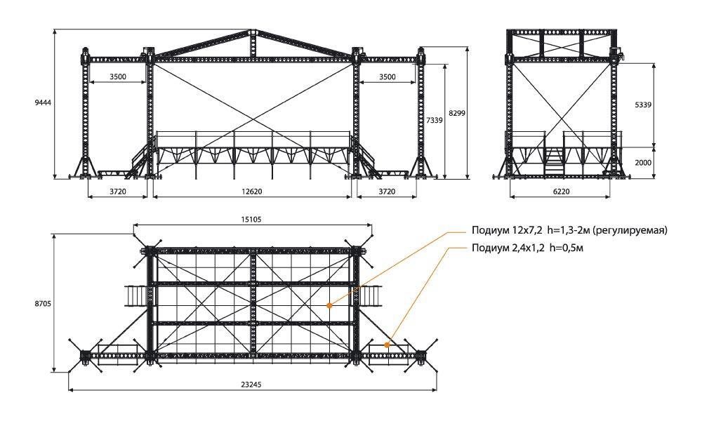 Сценический комплекс с замкнутым коньком с размером подиума 12 х 7,2 м, с электрической лебедкой и звуковыми порталами