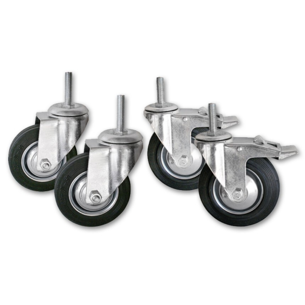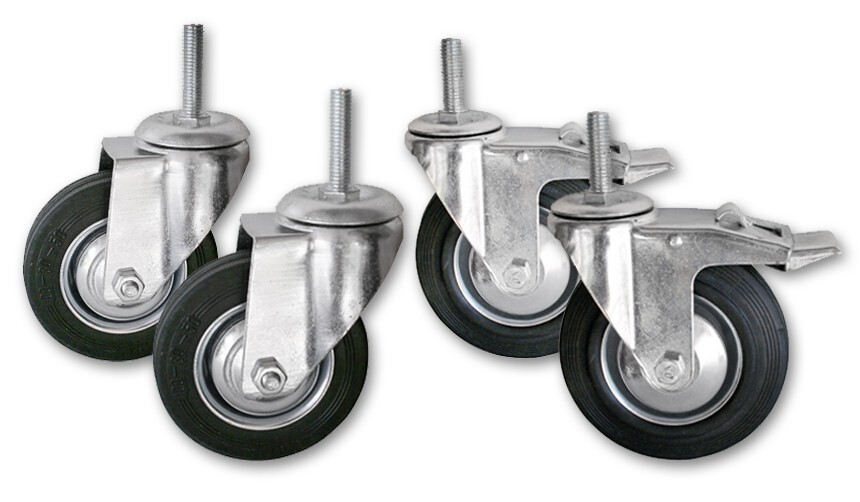 В комплект входят: 2 колеса с тормозом, 2 колеса без тормоза.