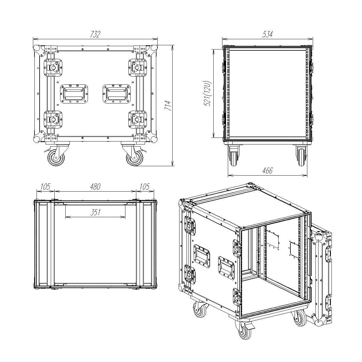 Рэковый кейс 12U, глубина 480мм, DIN рейка с 2-х сторон, ламинированная фанера 9мм, с колесами d100мм, 2-а колеса с тормозом.