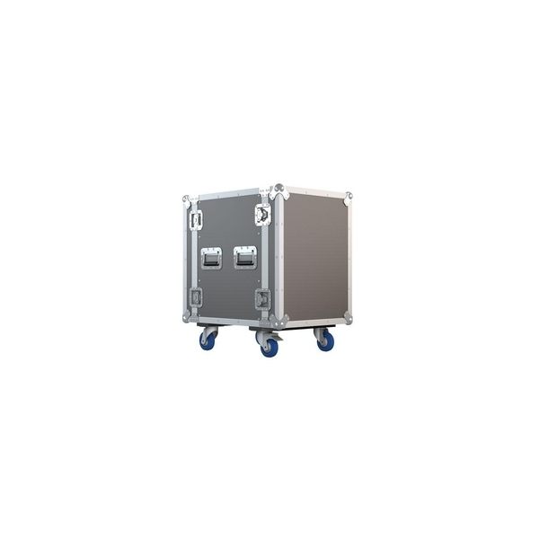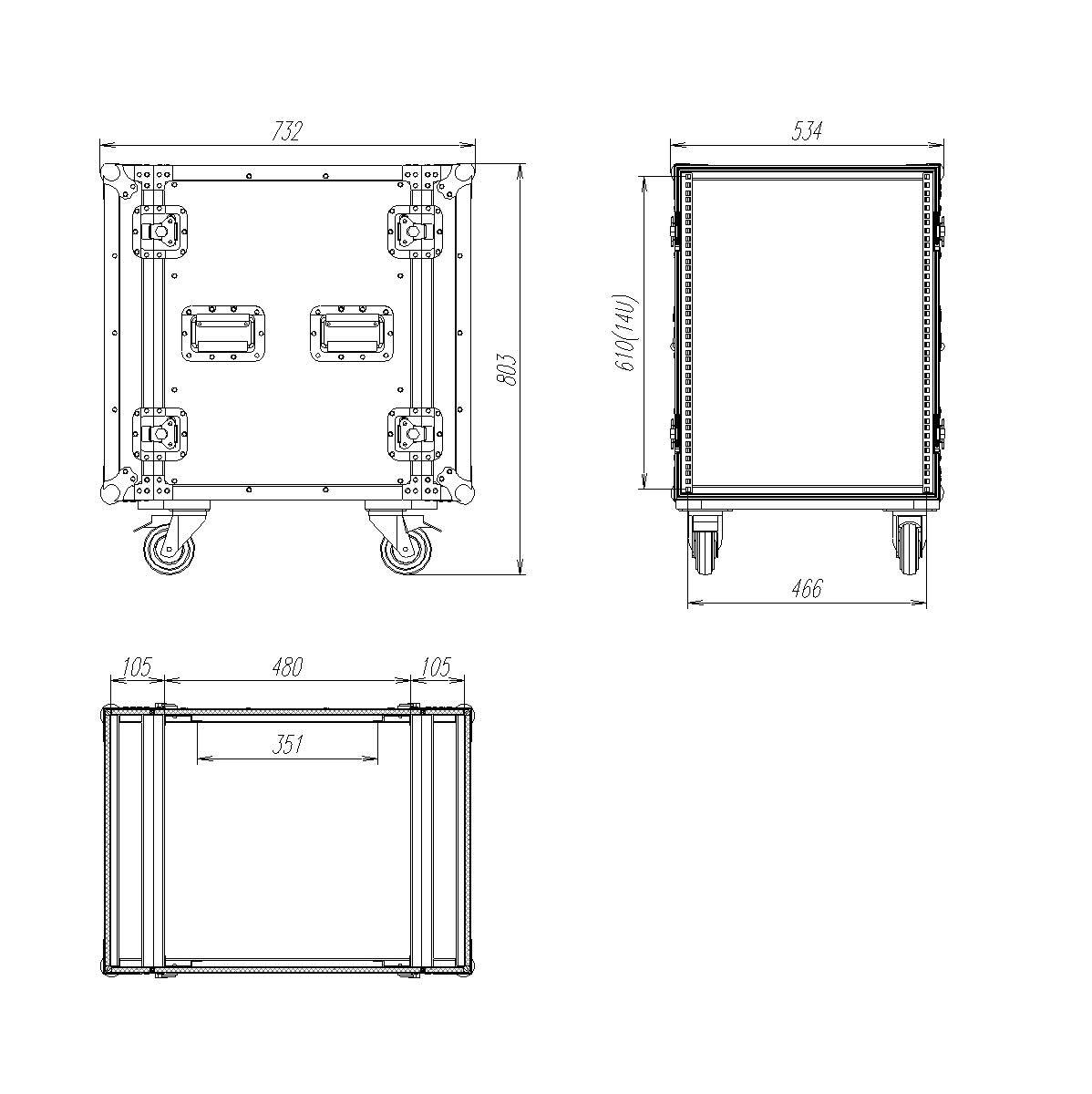 Рэковый кейс 14U, глубина 480мм, DIN рейка с 2-х сторон, ламинированная фанера 9мм, с колесами d100мм, 2-а колеса с тормозом.