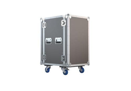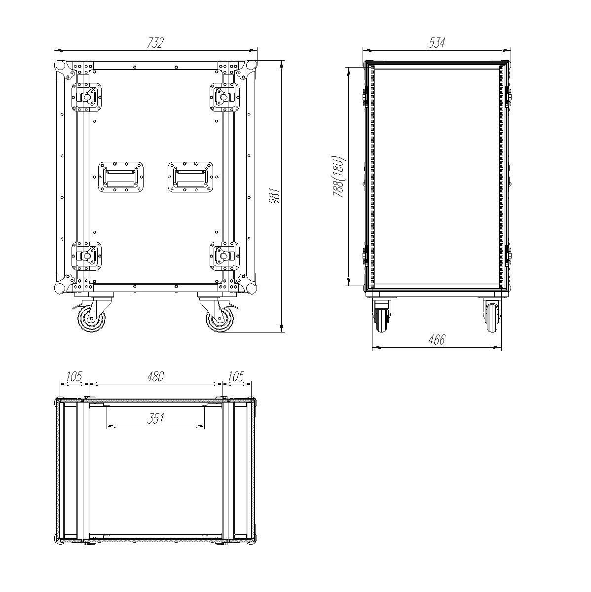 Рэковый кейс 18U, глубина 480мм, DIN рейка с 2-х сторон, ламинированная фанера 9мм, с колесами d100мм, 2-а колеса с тормозом.
