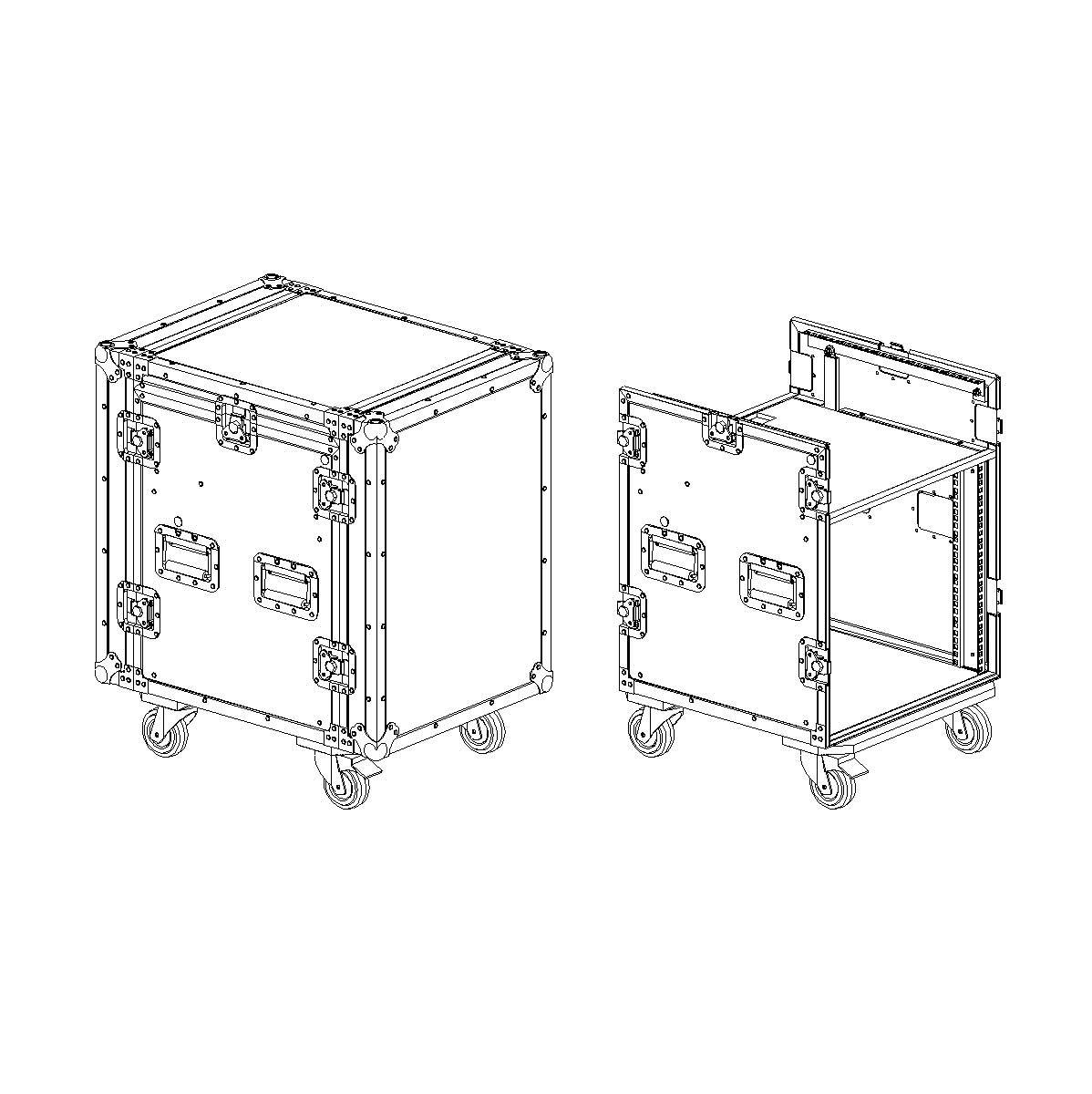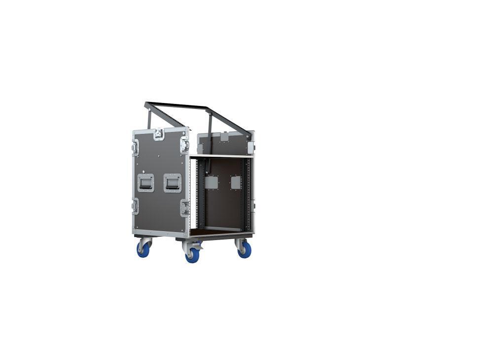Рэковый кейс 10U с верхней консолью 10U, глубина 480мм, DIN рейка с 2-х сторон, ламинированная фанера 9мм, с колесами d100мм, 2-а колеса с тормозом.