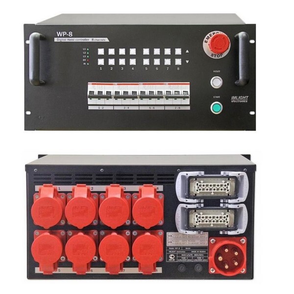 Блок управления цепными лебедками, 8 каналов, автоматы 3п10А, реверсивные контакторы, ввод питания: вилка CEE 5п32А, подключение потребителей: розетки CEE 4п16А (8 шт.) или HARTING 16pin (2 шт.), органы управления на передней панели, возможность подключения внешнего пульта управления HC-16, исполнение корпуса рэковое, высота 5U.